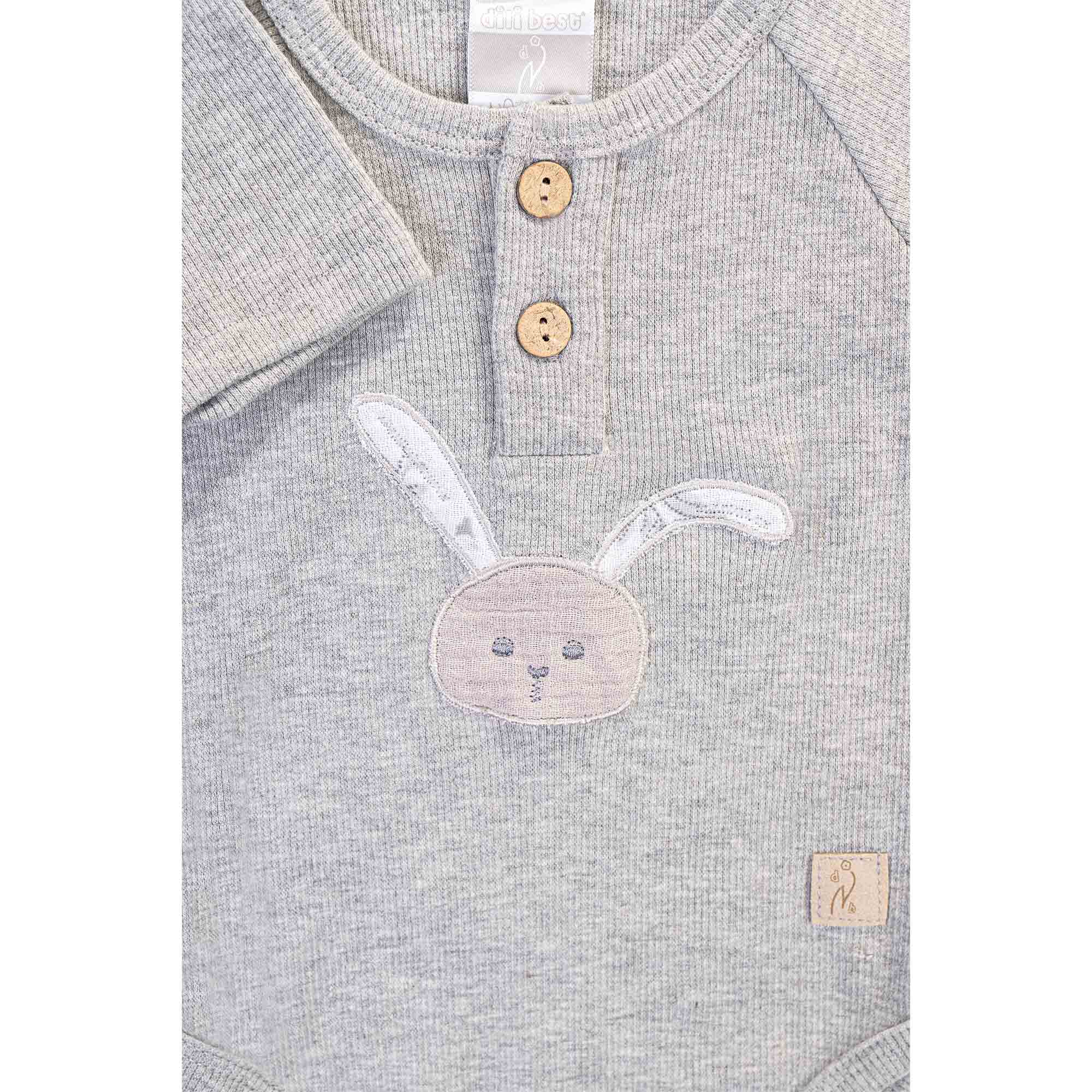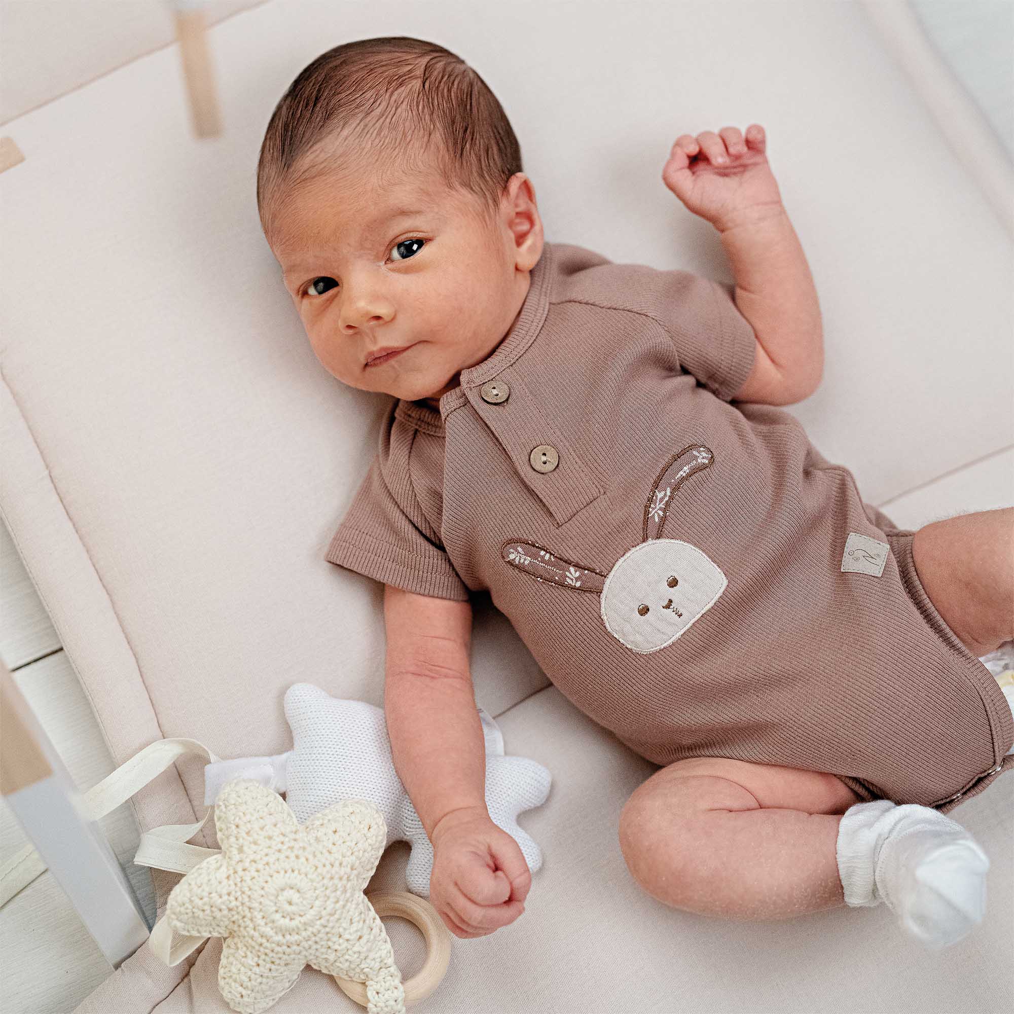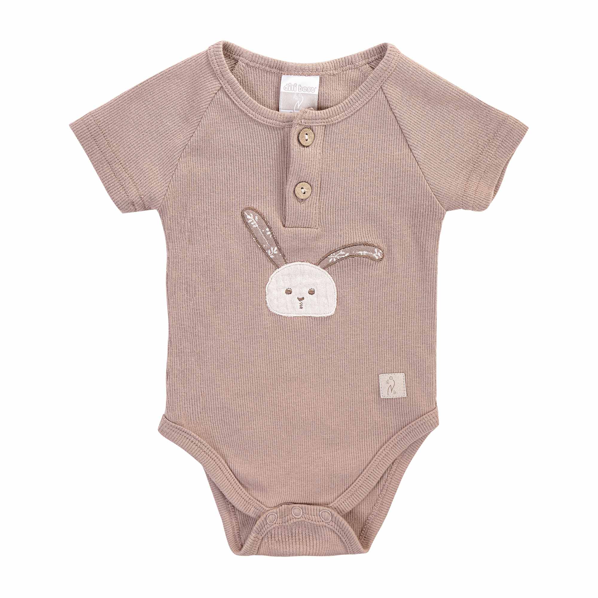 Kurzärmliger Body mit gesticktem Hasen aus gestreifter Bio-Baumwolle.