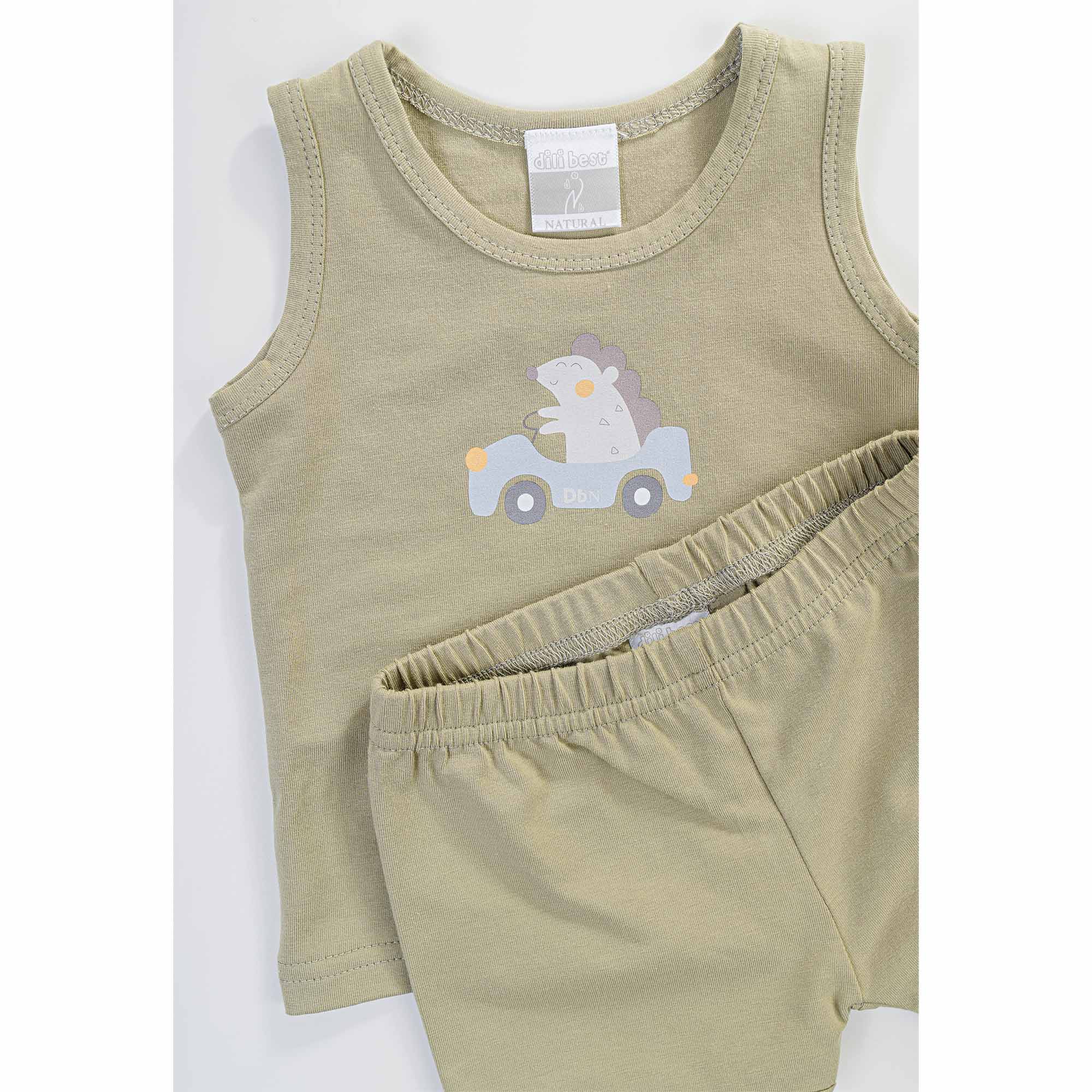 Set aus Tanktop mit Auto-Print und kurzer Hose aus Bio-Baumwolle in Olive und Taupe farbe.