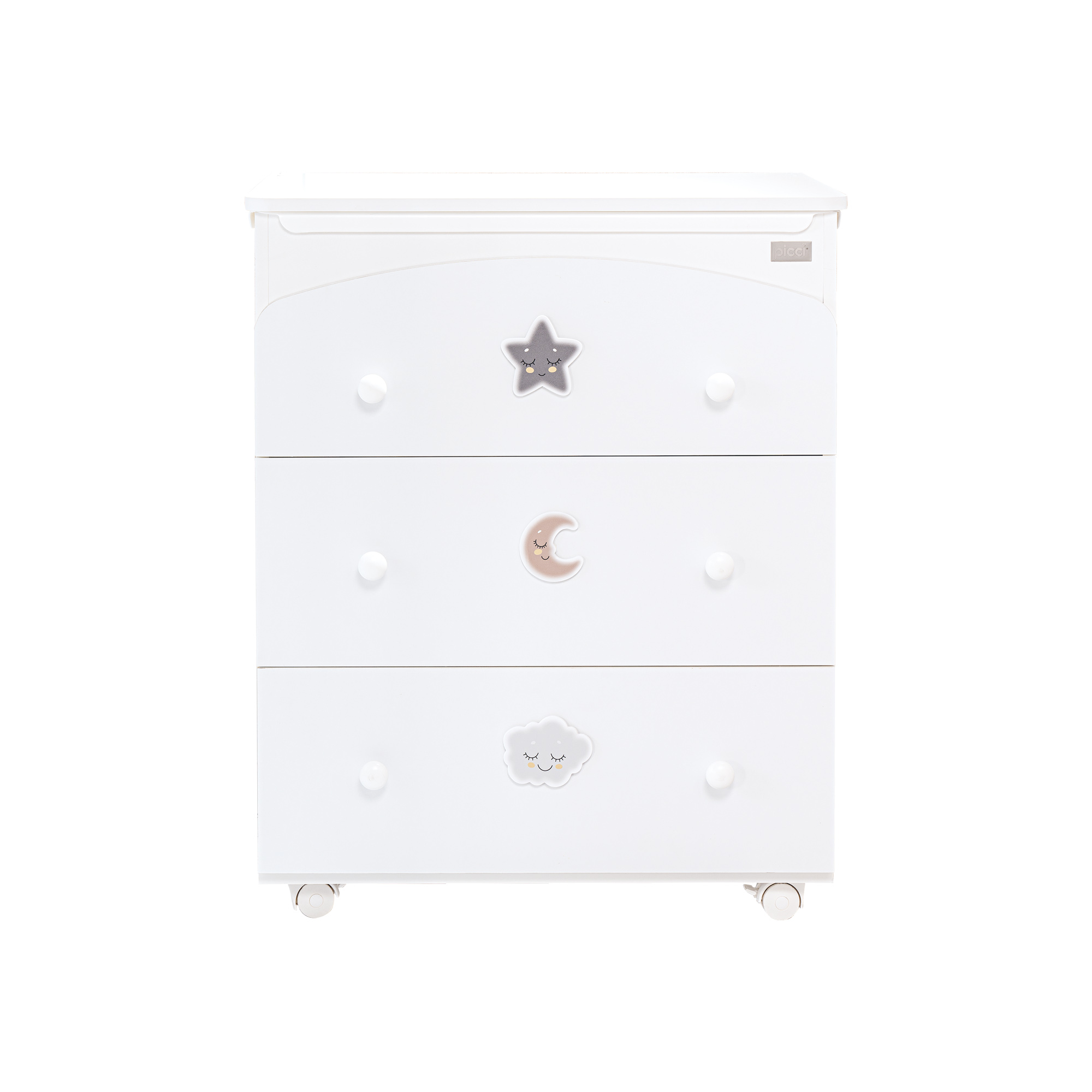 Die lackierte Holzkommode aus der Smile-Kollektion eignet sich perfekt zur Vervollständigung des Kinderzimmers und bietet ausreichend Platz für die Aufbewahrung der gesamten Babykleidung. Widerstandsfähig und von hervorragender Qualität wird es das Wachstum von Kindern über viele Jahre hinweg begleiten. Er ist mit weißen Kugelknöpfen verziert und wird mit einem passenden Deko-Set bestehend aus drei Teilen verkauft: Mond, Stern und graue Wolke.
