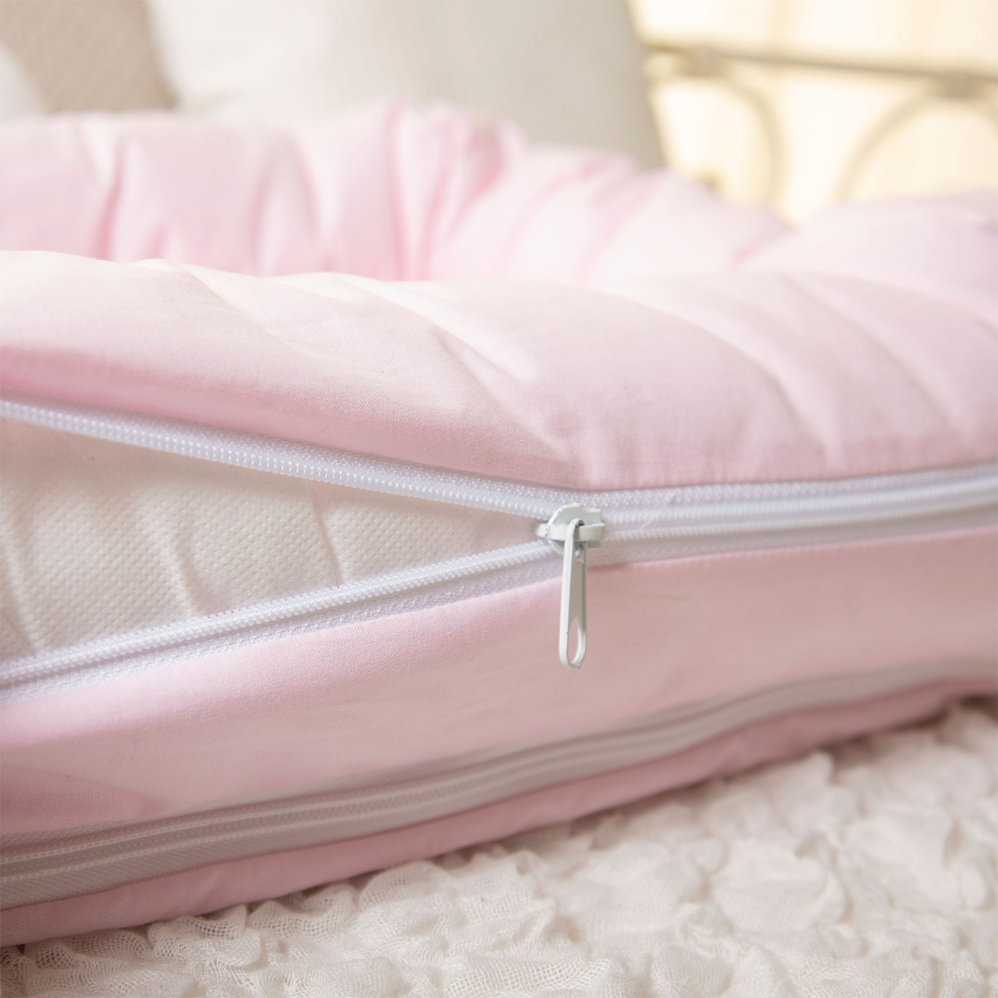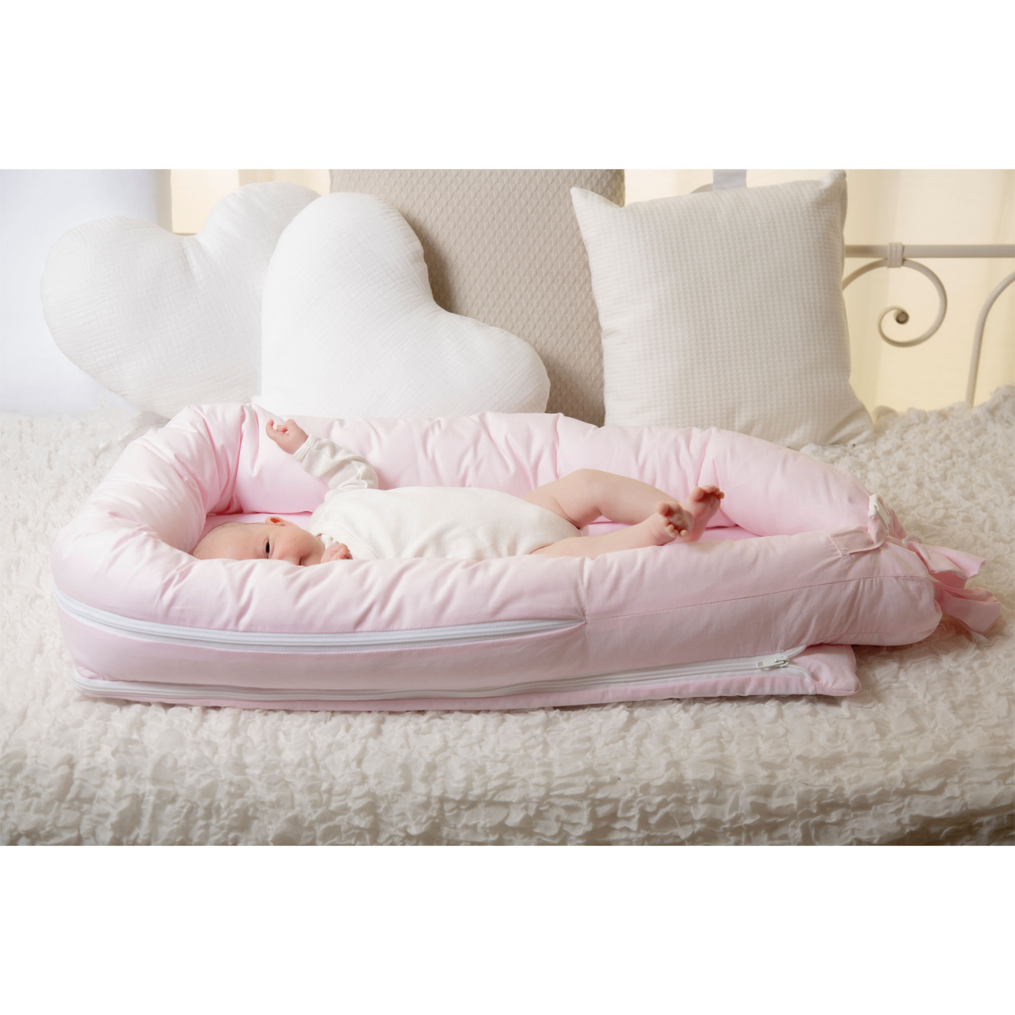 Doppelter Reißverschluss zum einfachen Abnehmen des Oberteils von der Matratze, sowohl zum Waschen als auch zur Verwendung mit einem Reduzierbehälter. Interne hypoallergene Watte mit TNT-Beschichtung für eine praktischere und hygienischere Extraktion, einfache Waschmethode, die auch durch die Extraktionsfähigkeit begünstigt wird. Weicher Schutz, der für Ihr Baby in den ersten Lebensmonaten notwendig ist, mit der Abgrenzung einer kleinen Schlafumgebung.